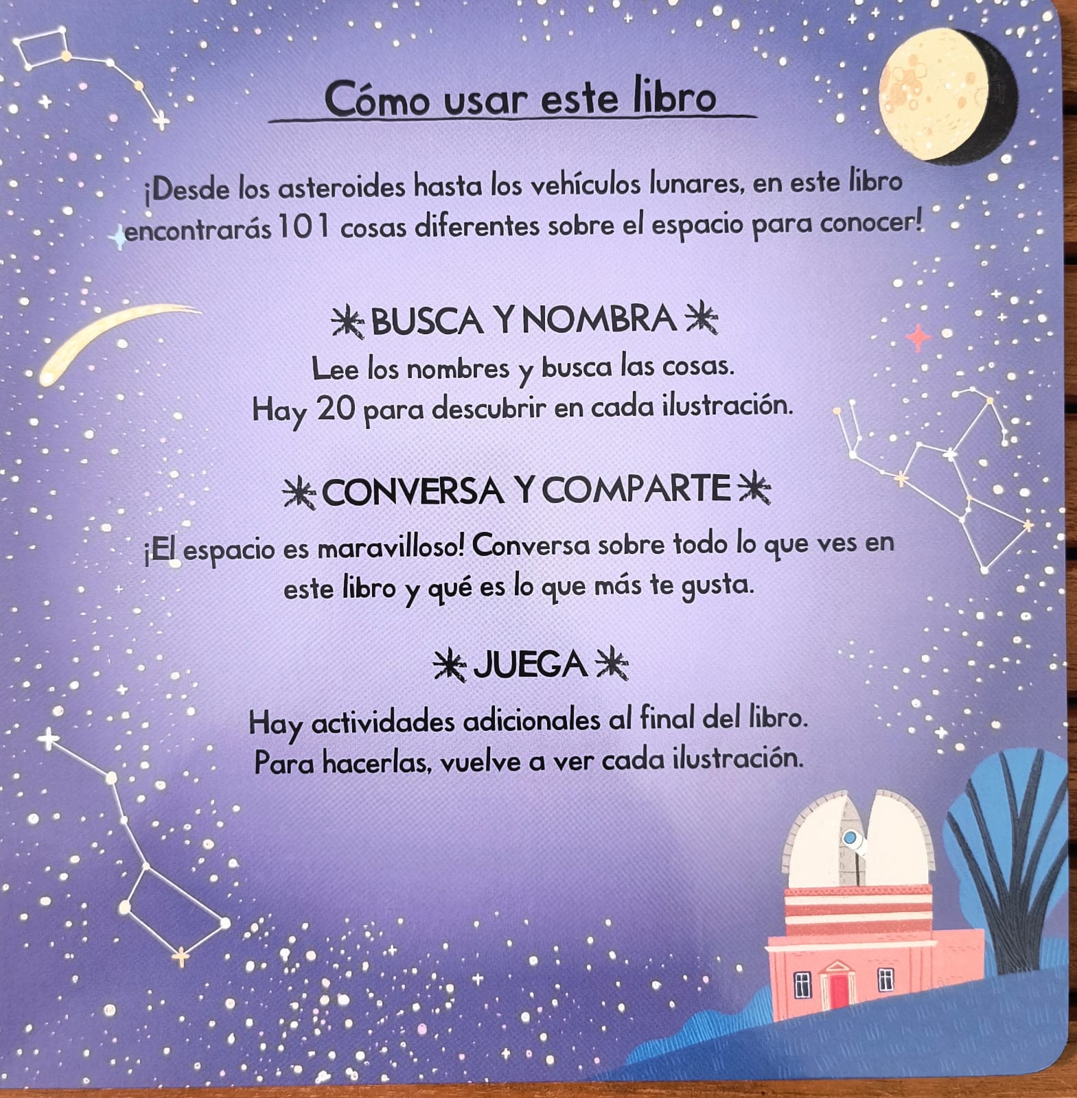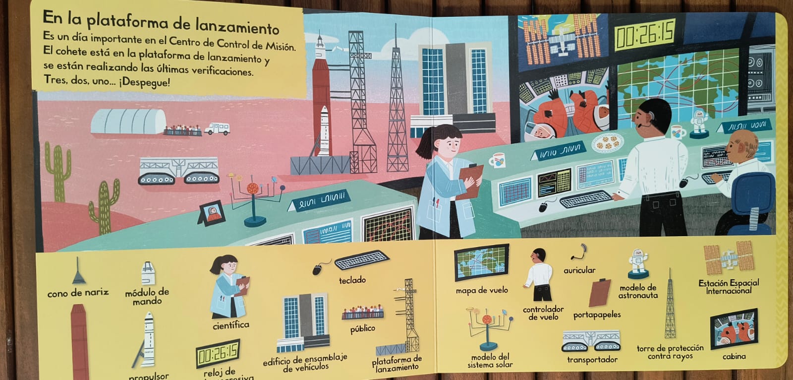 Las páginas de cartón con simpáticas ilustraciones estimulan las habilidades de localización y búsqueda mientras los pequeños aprenden los nombres de cosas del espacio y relacionan cada grupo con su entorno.