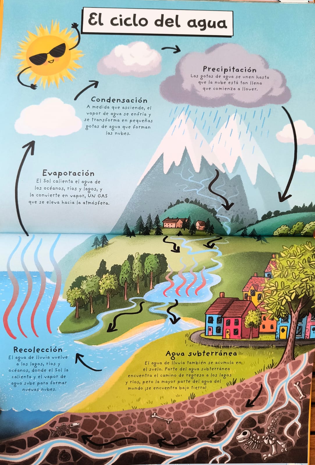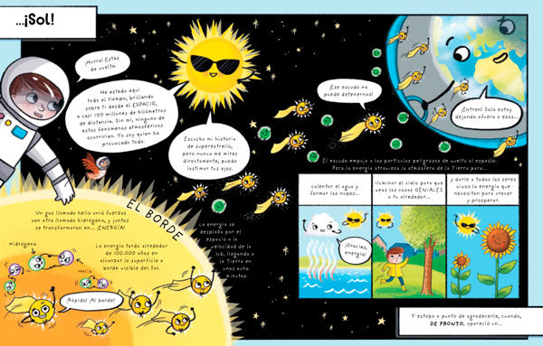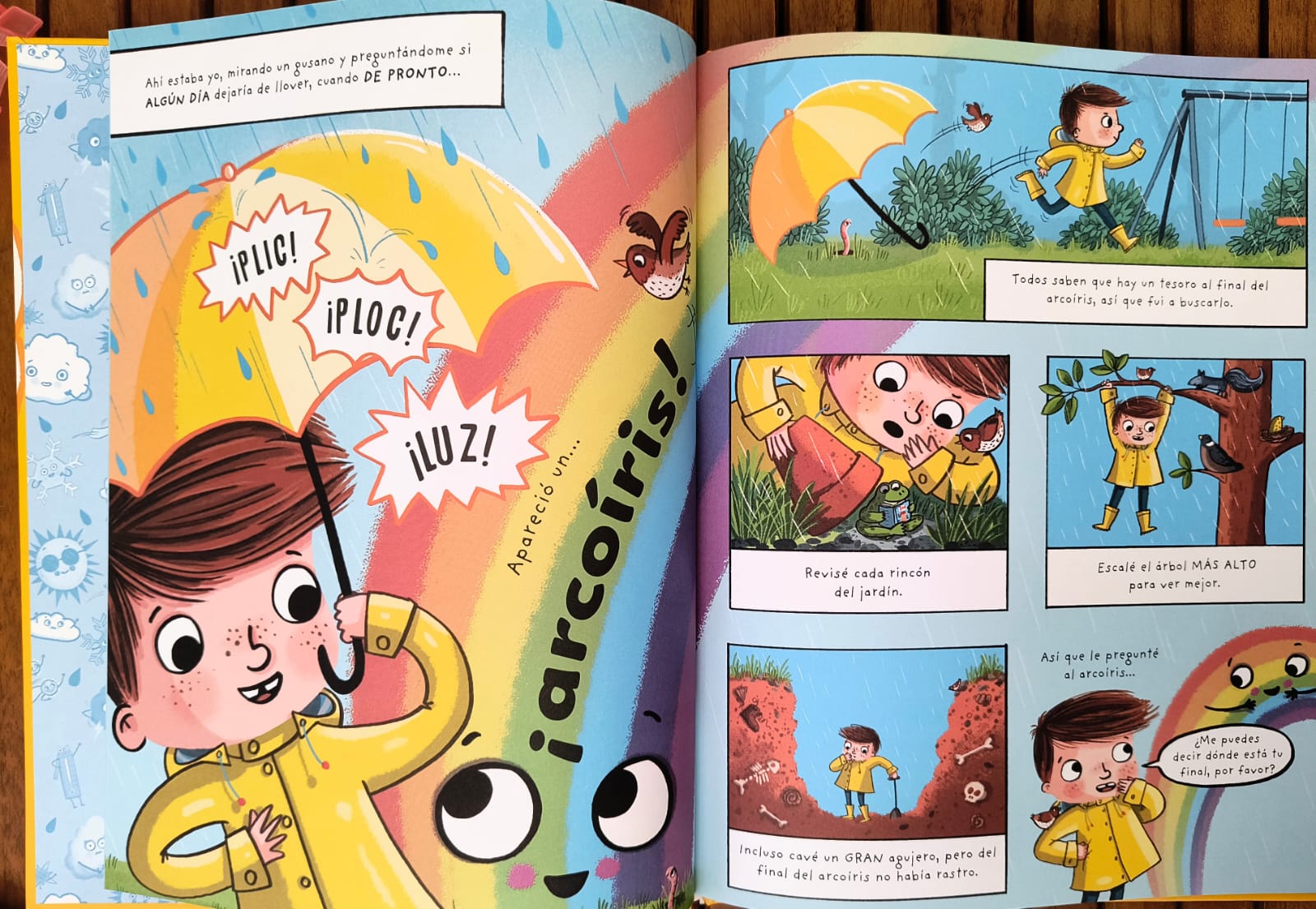 Apareció… un arcoíris responde a estas y muchas otras preguntas sobre el tiempo atmosférico, con un estilo divertido y lleno de humor al estilo cómic. Con personajes coloridos —desde nubes gruñonas hasta nieblas amigables—, cada página revela una mini historia que explica cómo se forman los fenómenos del clima.