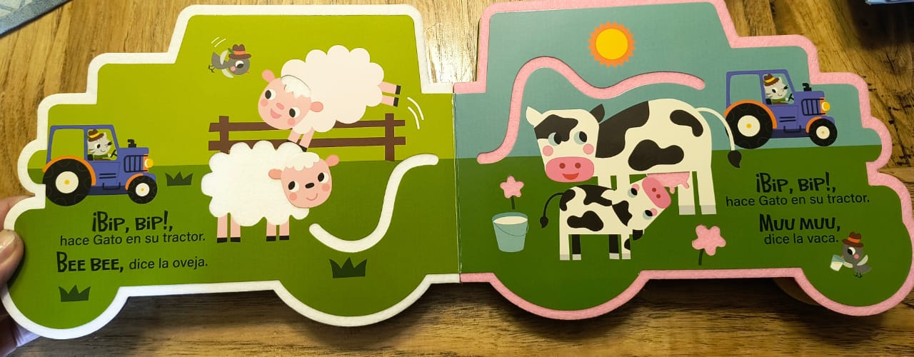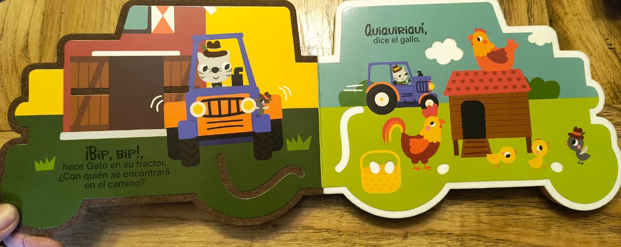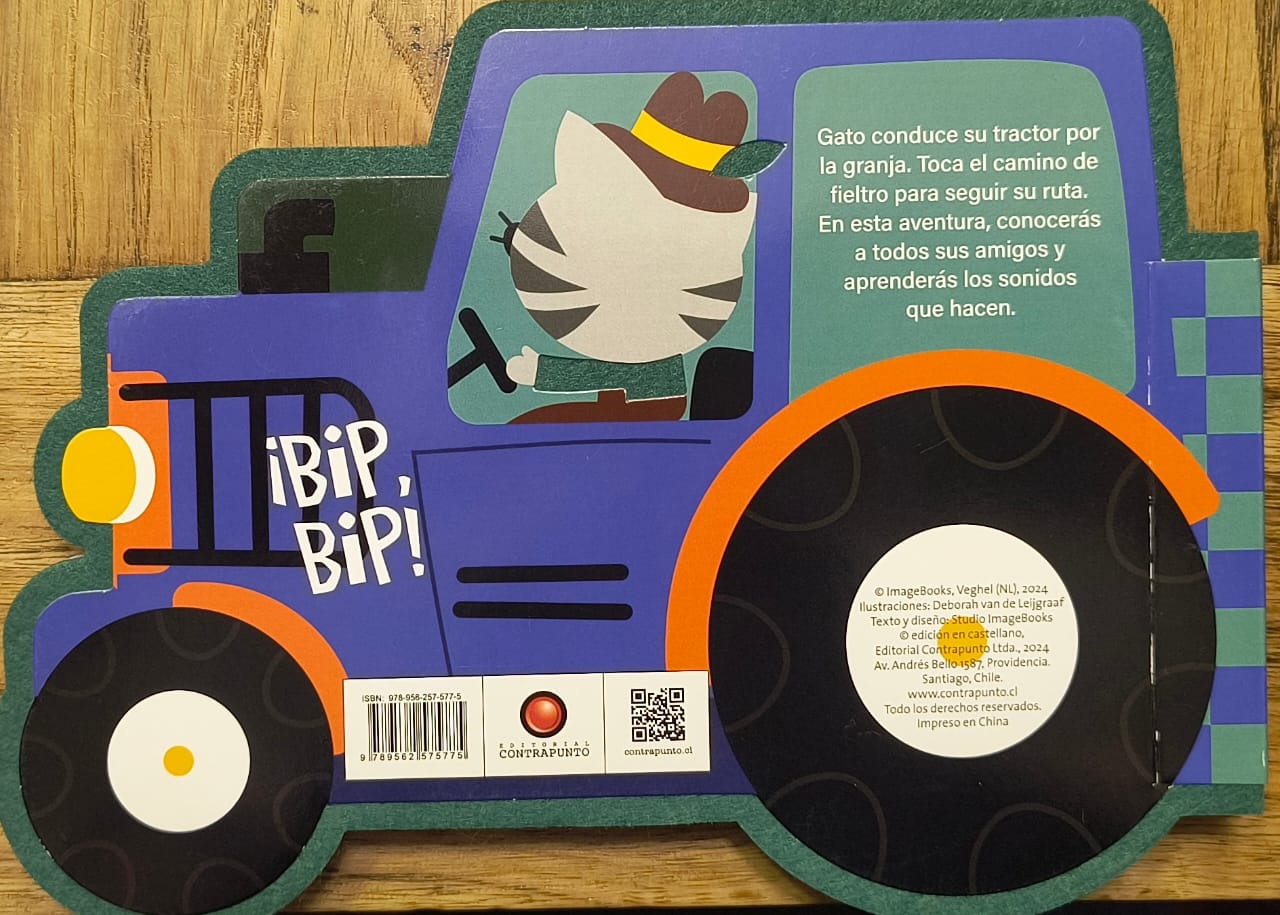 Con texturas de fieltro pensadas para manos pequeñas, Gato y su tractor. ¡Bip, bip! traslada al lector a una granja donde Gato conduce su tractor mientras Oso maneja un camión; las pistas táctiles invitan a seguir con el dedo los caminos y descubrir detalles que refuerzan la coordinación y la atención. La propuesta, firmada por Deborah van de Leijgraaf, combina ritmo y sonido en frases breves que acompañan el juego sensorial.