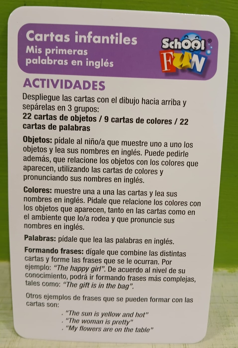 Embárcate en el fascinante viaje del idioma inglés con “Mis Primeras Palabras en Inglés”, una colección de 55 cartas que abre las puertas del vocabulario de manera educativa y divertida. Cada carta presenta palabras clave, imágenes vibrantes y actividades diseñadas para que los niños exploren y aprendan el inglés de manera lúdica.