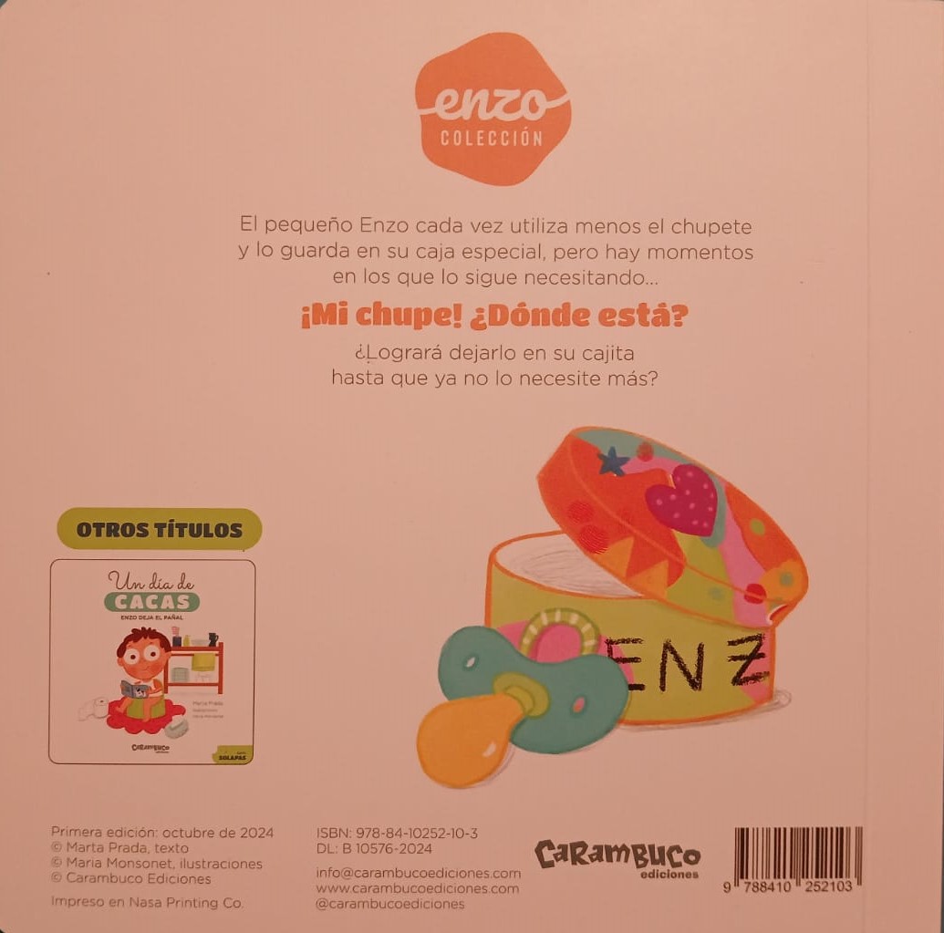 Cuento con solapas para dejar el chupete de manera respetuosa. Una divertida historia, basada en el método Montessori, para aprender a dejar el chupete y descubrir en cada solapa. ¡que todos podemos dejar el chupete! El pequeño Enzo cada vez utiliza menos el chupete y lo guarda en su caja especial, pero hay momentos en los que lo sigue necesitando. ¡Mi chupe! ¿Dónde está? ¿Logrará dejarlo en su cajita hasta que ya no lo necesite más? A través de una historia tierna y divertida, los pequeños lectores acompañarán a Enzo en su camino para usar cada vez menos el chupete. Con la ayuda de su caja especial, Enzo va aprendiendo a dejarlo poco a poco, aunque todavía lo necesita en algunos momentos. Las solapas interactivas hacen que la lectura sea emocionante y atractiva para los niños, mientras descubren qué se esconde detrás de cada página. Este cuento es una herramienta educativa perfecta para familias que buscan recursos respetuosos para ayudar a sus hijos a abandonar el chupete. Con valores como la autonomía, la paciencia y el respeto por los ritmos de cada niño, Chupe, te dejo es un excelente aliado en este proceso.