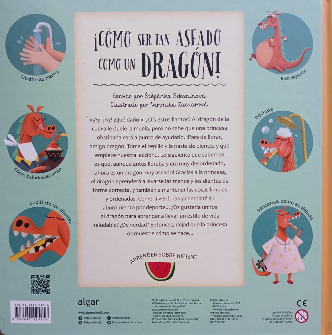 Un libro ilustrado para aprender todo lo que necesitas saber sobre hábitos de vida saludable. «¡Ay! ¡Ay! ¡Cómo duele!». ¿Oís esos lloros? Al dragón de la cueva le duele la muela, pero no sabe que una princesa obstinada está a punto de ayudarle. ¡Venga, para de llorar, amigo dragón! Coge el cepillo y la pasta de dientes y que empiece la lección… Lo siguiente que sabemos es que, aunque antes lloraba y era muy desordenado, ¡ahora es un dragón muy aseado! Gracias a la princesa, aprenderá la forma correcta de lavarse las manos y los dientes, y también cómo mantener las cosas limpias y ordenadas. Comerá verduras y cambiará su aburrimiento por deporte… ¿Os gustaría uniros al dragón para aprender un estilo de vida saludable? ¿De verdad? Entonces, dejad que la princesa os enseñe cómo se hace… Echad una ojeada a estas páginas y aprenderéis a limpiaros las manos, comer saludablemente, hacer deporte o cepillaros los dientes con el dragón más aseado de todo el reino.