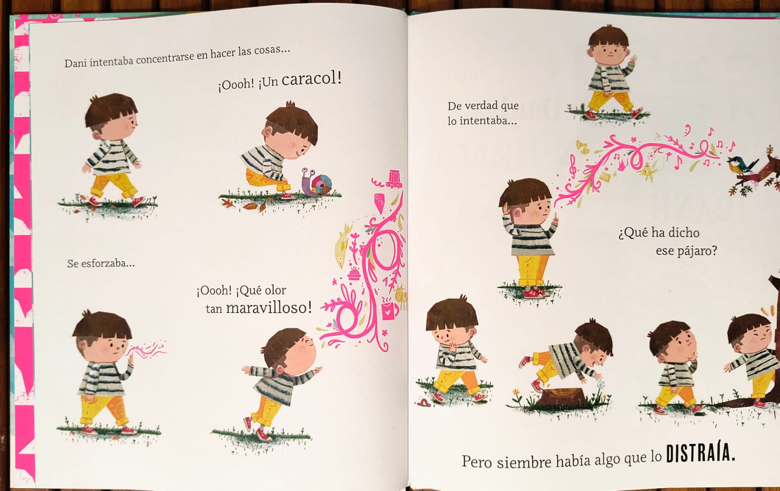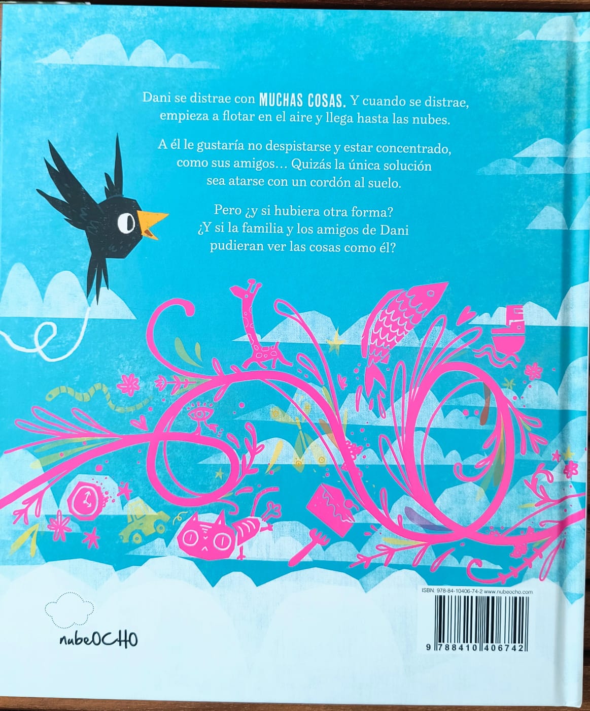 Dani está en las nubes. Él intenta concentrarse y admira a las personas de su alrededor que consiguen hablar de un tema durante mucho tiempo, ordenar sus juguetes o leer un libro largo… Parece muy fácil, pero él siempre se distrae con algún pensamiento, olor o color. Y entonces empieza a flotar y a imaginar hasta perderse entre las nubes.