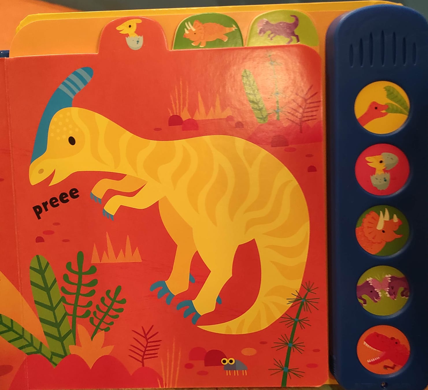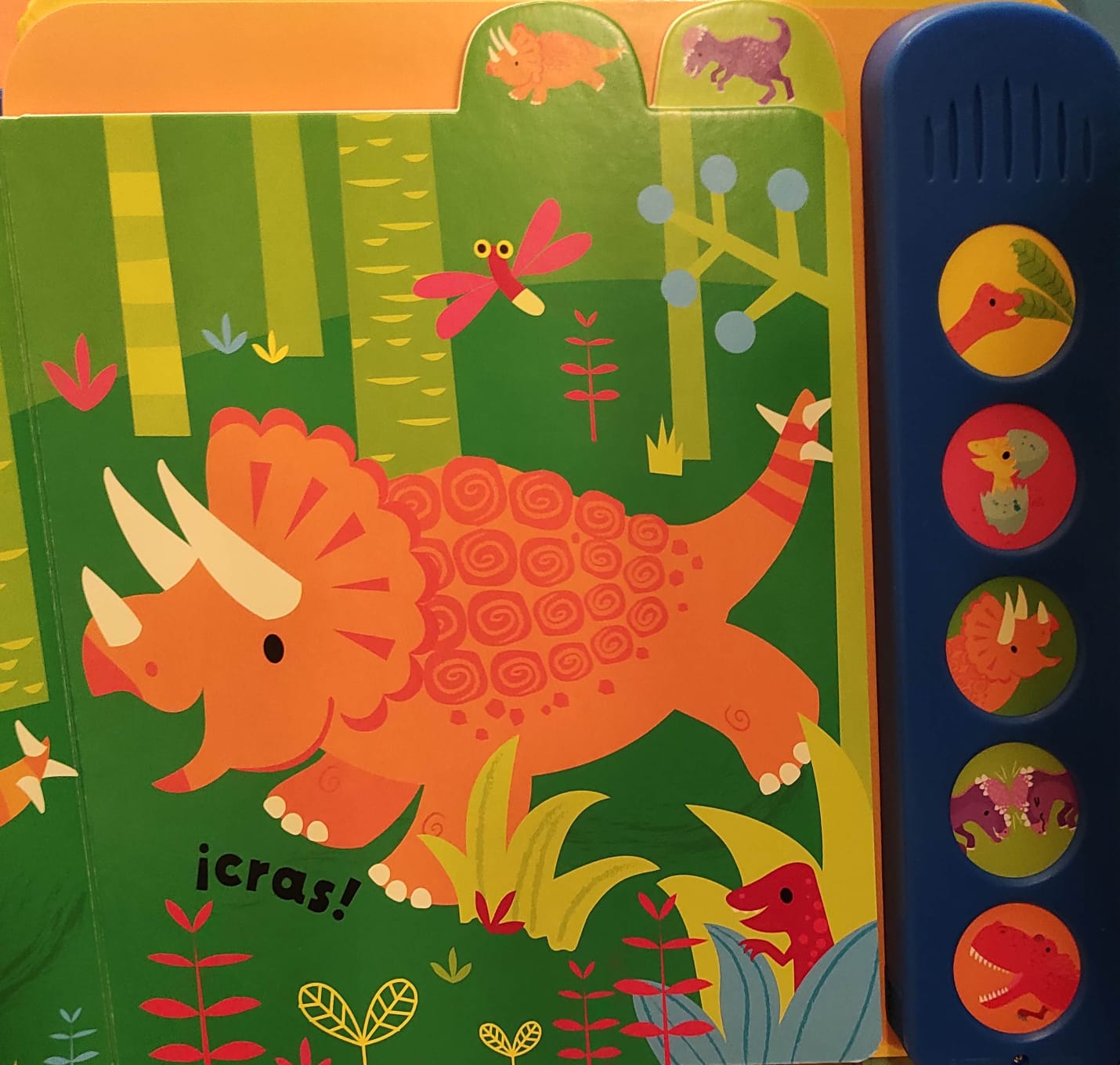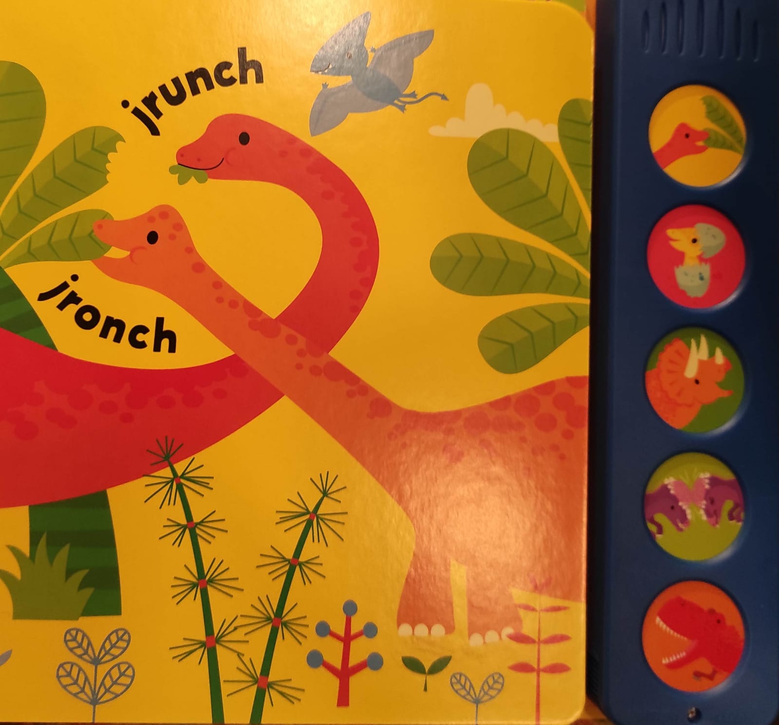 Los bebés descubrirán los sonidos de distintos dinosaurios al tocar los botones de este hermoso libro ilustrado. Un diplodocus hambriento, dinosaurios que chillan, un enorme T-rex que ruge y muchos más.