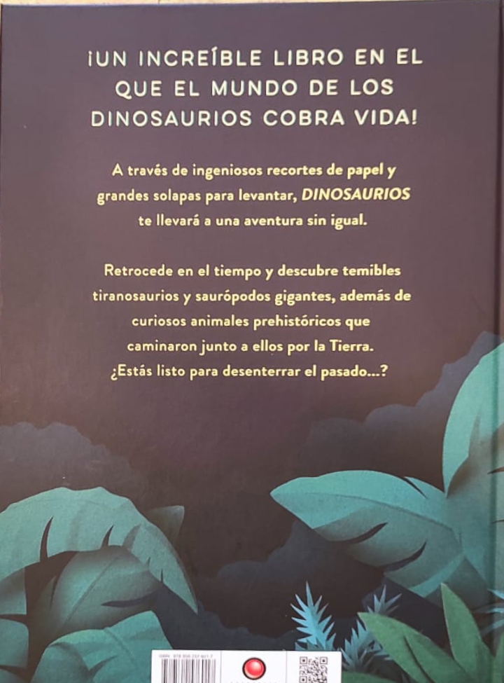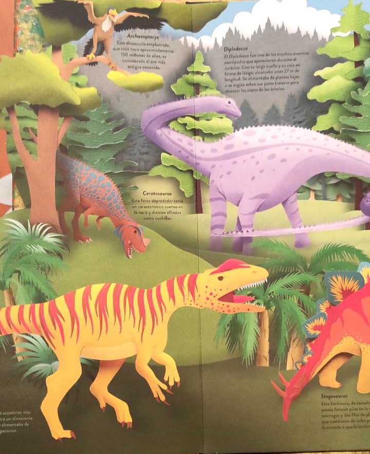 Cada página despliega capas superpuestas, recortes minuciosos y solapas interactivas que convierten la observación en una experiencia táctil y visual: saurópodos imponentes, depredadores ágiles, reptiles marinos y pterosaurios aparecen con volumen y detalle escultórico.