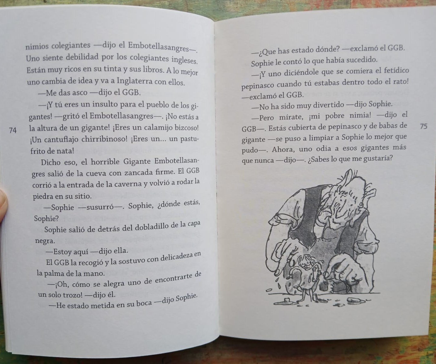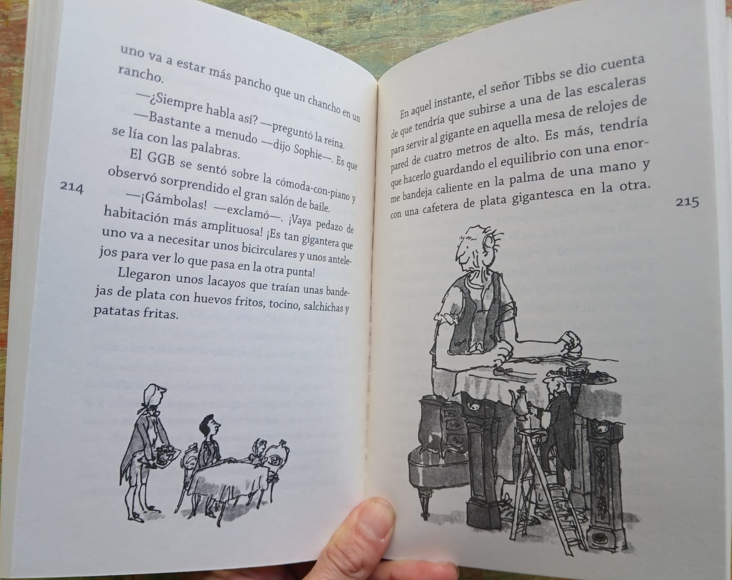 Aquella noche Sophie no lograba dormir, se lo impedía la luz de la luna que entraba por el dormitorio. A pesar de estar prohibido levantarse de la cama, se puso de pie y se acercó a la ventana. Entonces vio horrorizada que algo muy alto y muy negro y muy delgado se aproximaba por la calle. Era el Gran Gigante Bonachón, que la envolvió en una sábana y se la llevó al País de los Gigantes.
