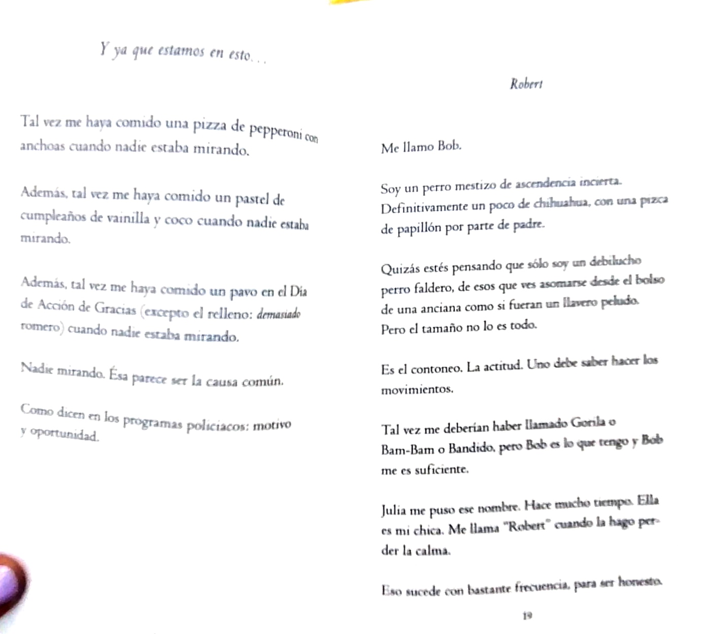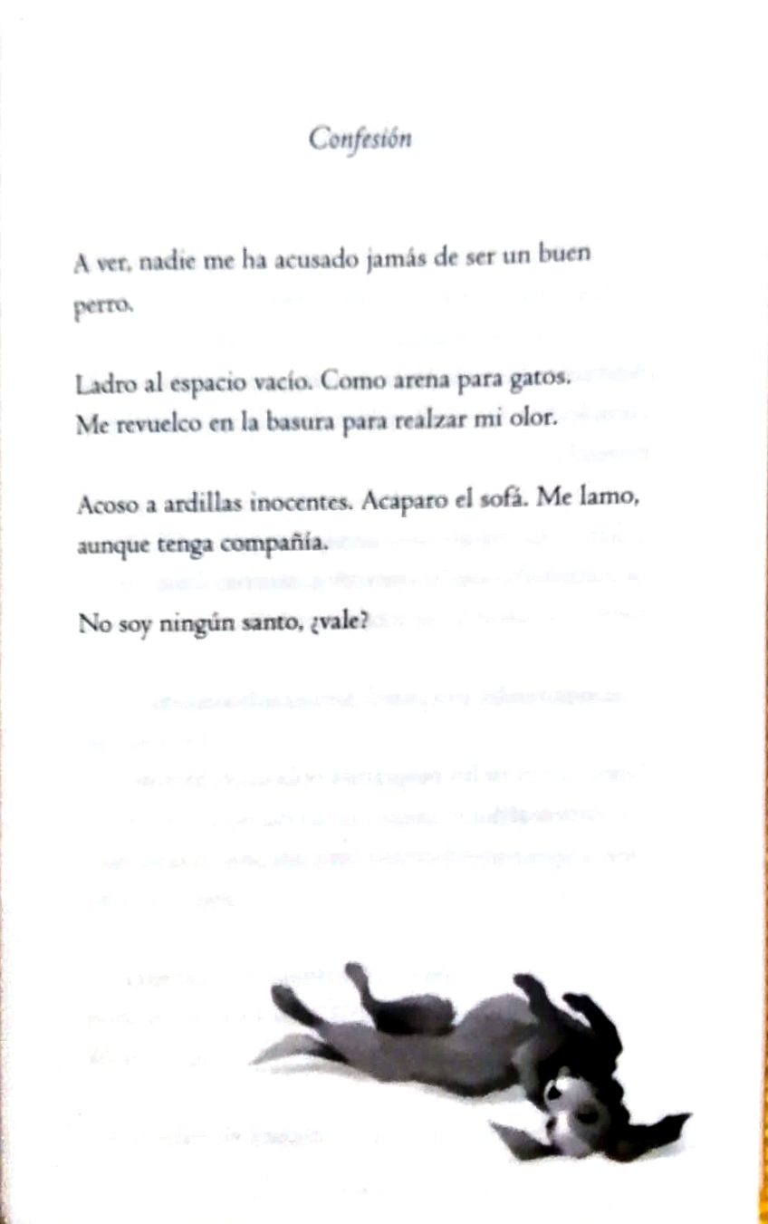 «Mira, nadie me ha acusado jamás de ser un buen perro. Ladro al espacio vacío. Como arena para gatos. Me revuelco en la basura para realzar mi olor. Acoso a ardillas inocentes. Acaparo el sofá. Me lamo, aunque tenga compañía. No soy un santo, ¿están de acuerdo?»