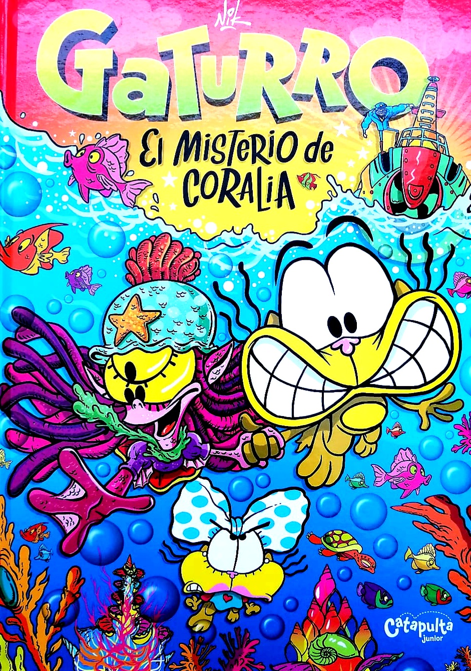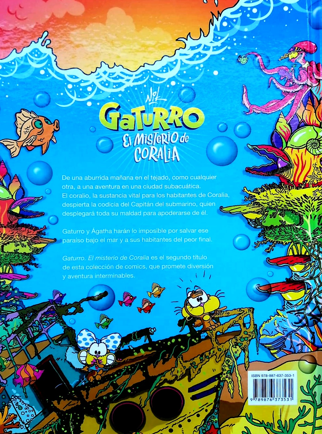 De una aburrida mañana en el tejado a una aventura en una ciudad subacuática. Gaturro y Agatha harán lo imposible por salvar a los habitantes de Coralia del malvado capitán del submarino, quien pondrá en peligro sus vidas y el destino de ese paraíso bajo el mar. Gaturro – El misterio de Coralia es el segundo título de esta colección de comics que promete diversión y aventura interminables.