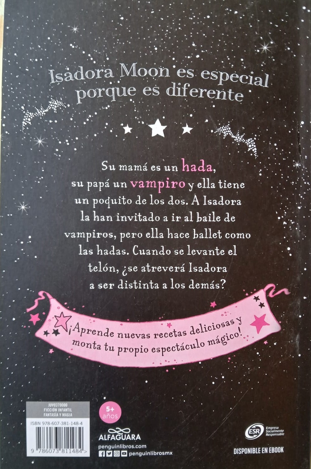 “Mitad hada, mitad vampiro, ¡y totalmente única! Esta noche…, ¡Isadora bailará! Isadora Moon es especial porque es diferente. Su mamá es un hada, su papá un vampiro y ella tiene un poquito de los dos. Así que, cuando toda la familia va a acampar junto al mar, suceden algunas cosas que no son demasiado normales… Isadora ha sido invitada al baile anual de vampiros, pero ella hace ballet como las hadas. Tendrá que preparar el baile de vampiros, ¡pero no quiere renunciar a ser en parte un hada! Cuando se levante el telón…, ¿se atreverá Isadora a ser distinta a los demás? Con irresistibles ilustraciones en negro y rosa y una heroína única, «Isadora Moon» es una encantadora y divertida serie de lecturas ideal para jóvenes lectores que quieren flores y purpurina, pero a los que también les atrae el mundo misterioso de los vampiros. Además, en este volumen… – ¡aprende nuevas recetas deliciosas! – ¡y monta tu propio espectáculo mágico!”