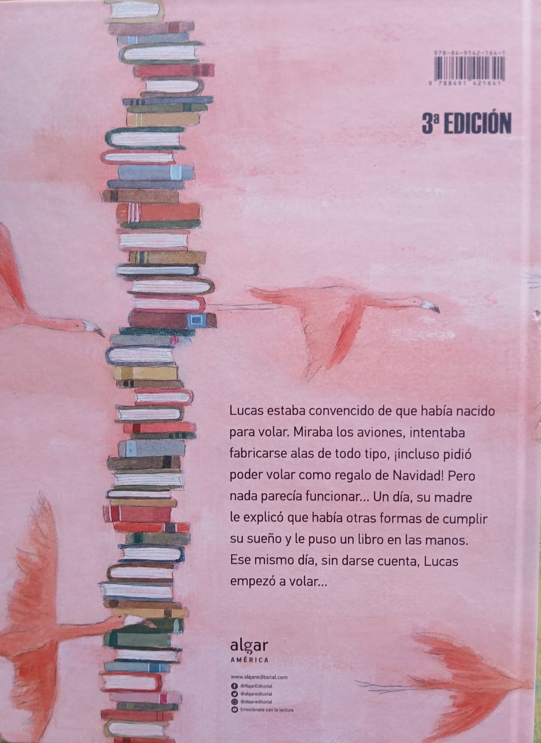 Lucas estaba convencido de que había nacido para volar. Miraba los aviones, intentaba fabricarse alas de todo tipo, ¡incluso pidió poder volar como regalo de Navidad! Pero nada parecía funcionar… Un día, su madre le explicó que había otras formas de cumplir su sueño y le puso un libro en las manos.