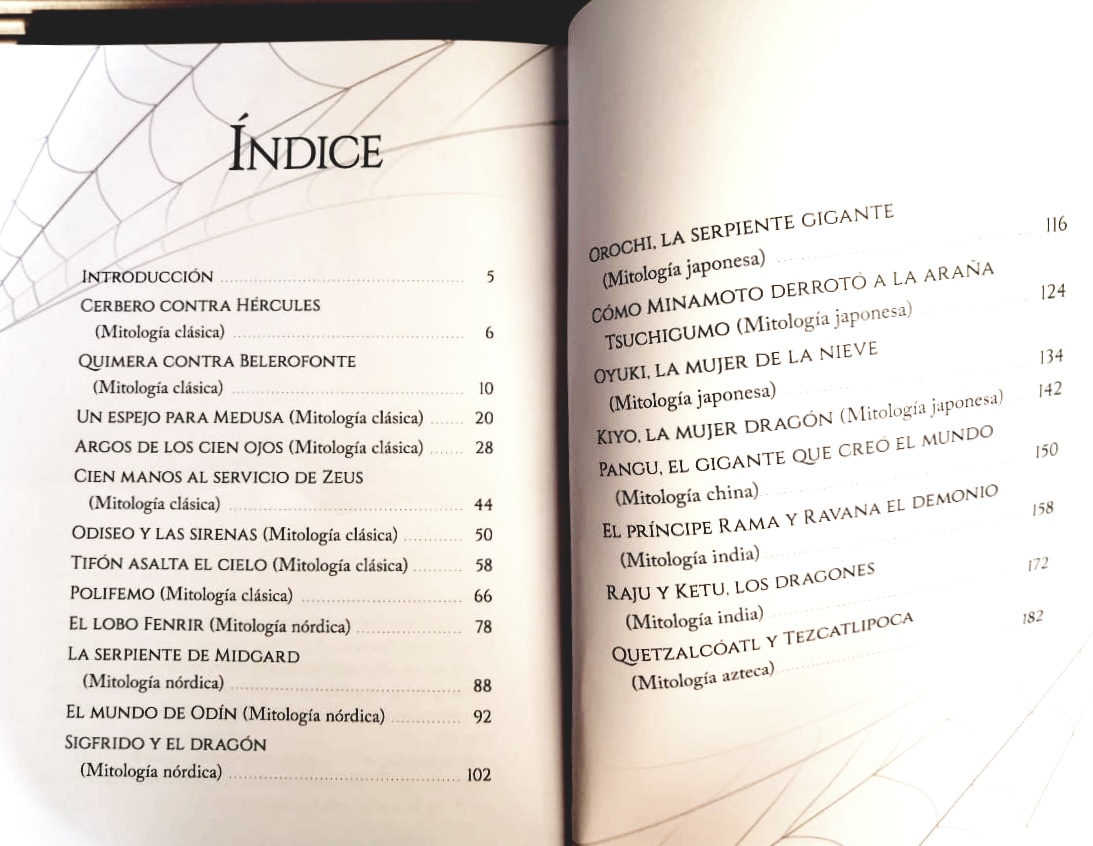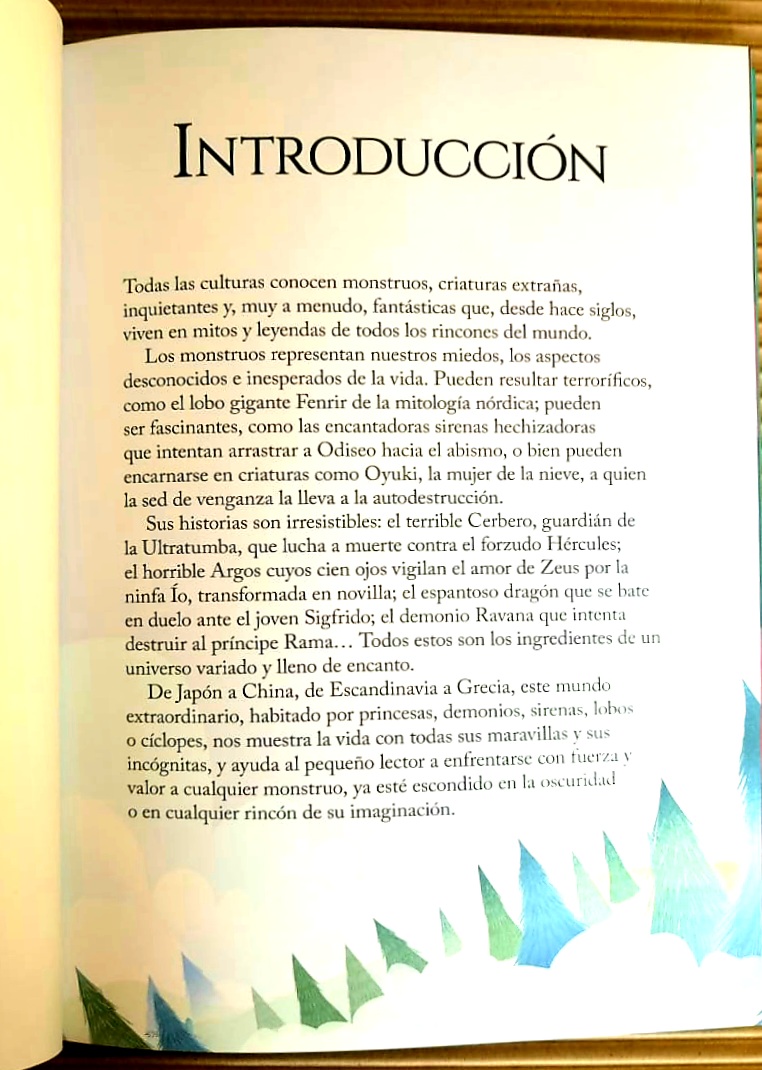 Todas las culturas conocen monstruos, criaturas extrañas, inquietantes y, muy a menudo, fantásticas que, desde hace siglos, viven en mitos y leyendas de todos los rincones del mundo. Los monstruos representan nuestros miedos, los aspectos desconocidos e inesperados de la vida. Pueden resultar terroríficos, como el lobo gigante Fenrir de la mitología nórdica; pueden ser fascinantes, como las encantadoras sirenas hechizadoras que intentan arrastrar a Odiseo hacia el abismo, o bien pueden encarnarse en criaturas como Oyuki, la mujer de la nieve, a quien la sed de venganza la lleva a la autodestrucción. Sus historias son irresistibles: el terrible Cerbero, guardián de la Ultratumba, que lucha a muerte contra el forzudo Hércules; el horrible Argos cuyos cien ojos vigilan el amor de Zeus por la ninfa Ío, transformada en novilla; el espantoso dragón que se bate en duelo ante el joven Sigfrido; el demonio Ravana que intenta destruir al príncipe Rama Todos estos son los ingredientes de un universo variado y lleno de encanto. De Japón a China, de Escandinavia a Grecia, este mundo extraordinario, habitado por princesas, demonios, sirenas, lobos o cíclopes, nos muestra la vida con todas sus maravillas y sus incógnitas, y ayuda al pequeño lector a enfrentarse con fuerza y valor a cualquier monstruo, ya esté escondido en la oscuridad o en cualquier rincón de su imaginación.