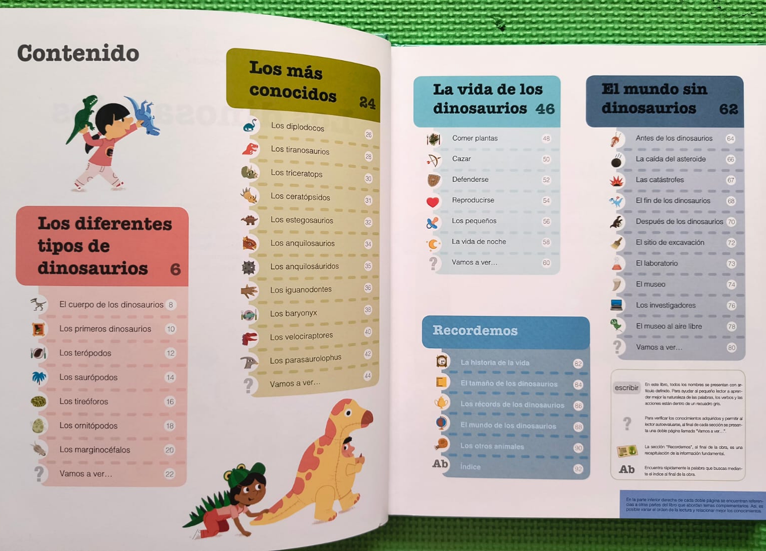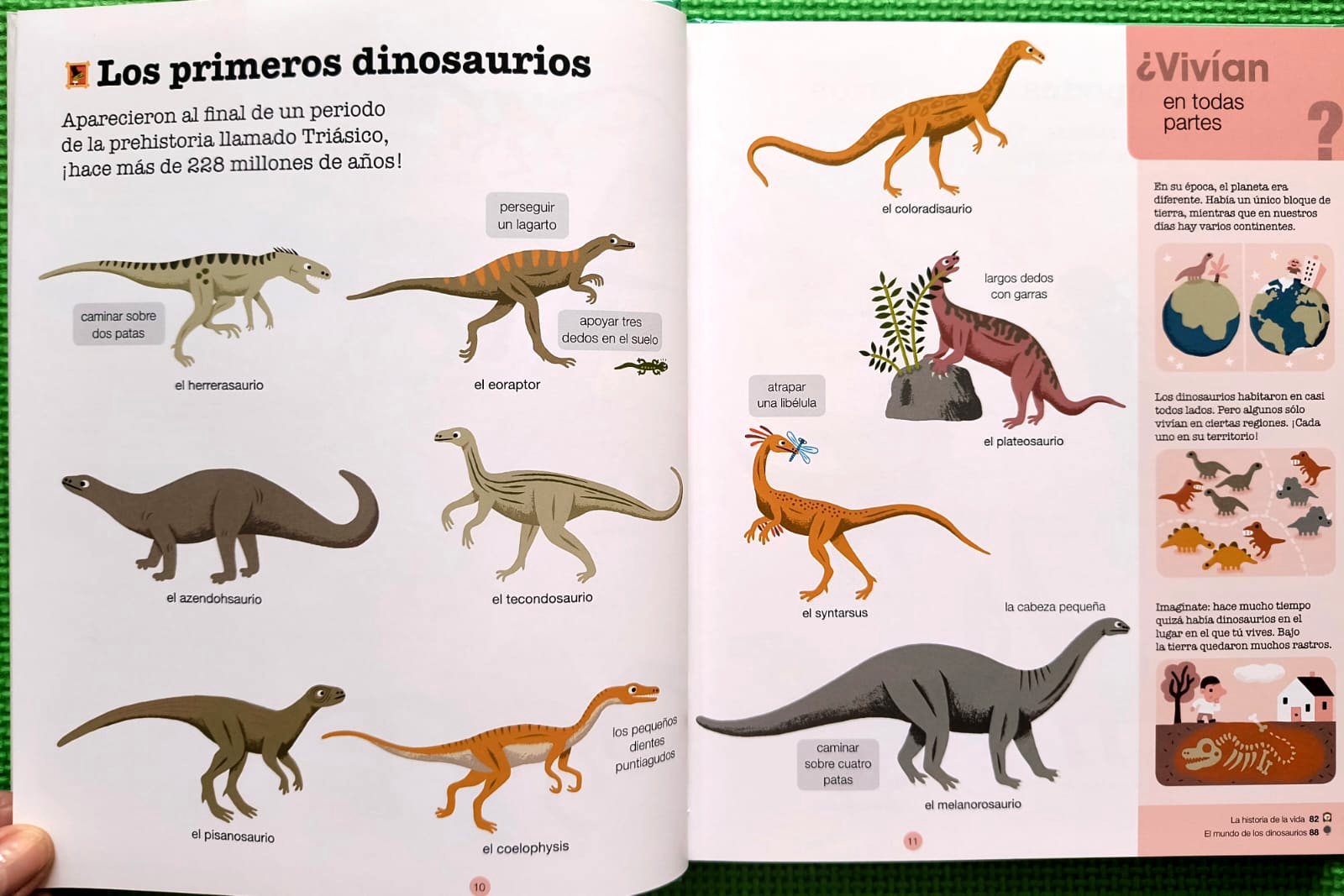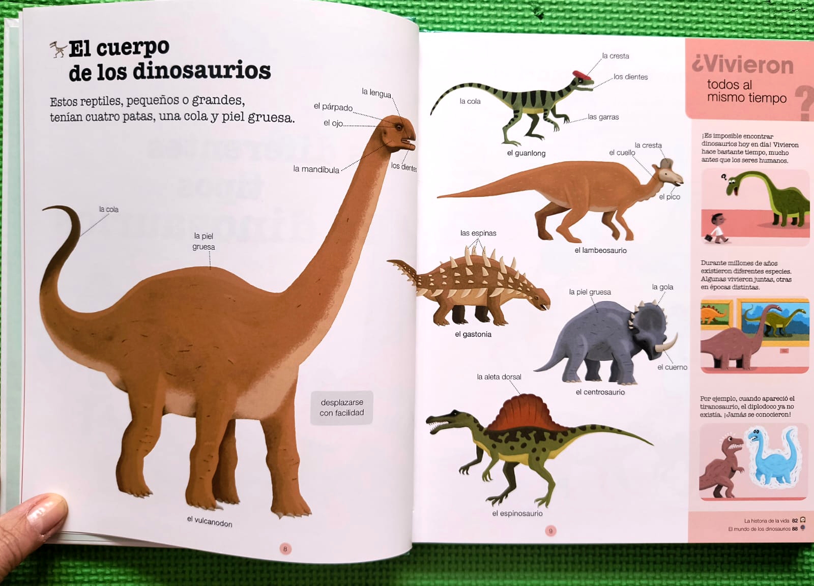 Si bien existen en el mercado muchos libros sobre dinosaurios dirigidos al público infantil, esta obra se distingue de las demás por el extremo cuidado de la edición, la rigurosa aproximación al tema y el atractivo concepto editorial. La autora se ha esmerado por crear una obra accesible a los lectores más pequeños, quienes tendrán a su disposición información actualizada y sistematizada sobre la época de los grandes reptiles. El libro muestra, entre otras cosas, cuáles son los diferentes tipos de dinosaurios, cómo eran, qué comían, cómo era su reproducción, qué produjo su extinción, etc. La obra incluye pequeños esquemas y páginas resumen.