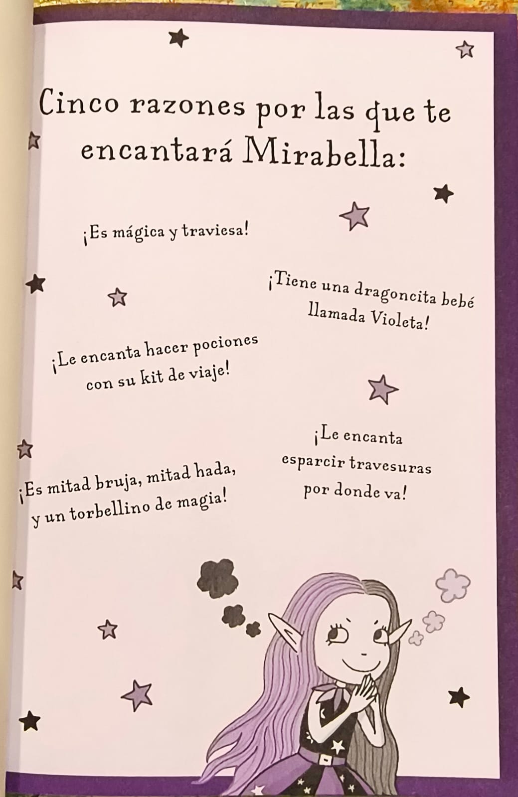 Mirabella es especial porque es distinta a los demás. Su mamá es una bruja y su papá es un hada, y Mirabella tiene un poquito de los dos… ¡y le encanta meterse en líos! En esta aventura, Mirabella va a la escuela de brujas, donde no puede evitar hacer de las suyas… Con irresistibles ilustraciones en negro y violeta y una heroína única, Mirabella es una encantadora y divertida serie de primeras lecturas. Ideal para lectores que quieren flores y purpurina, pero también trasnochar y hacer alguna travesura.