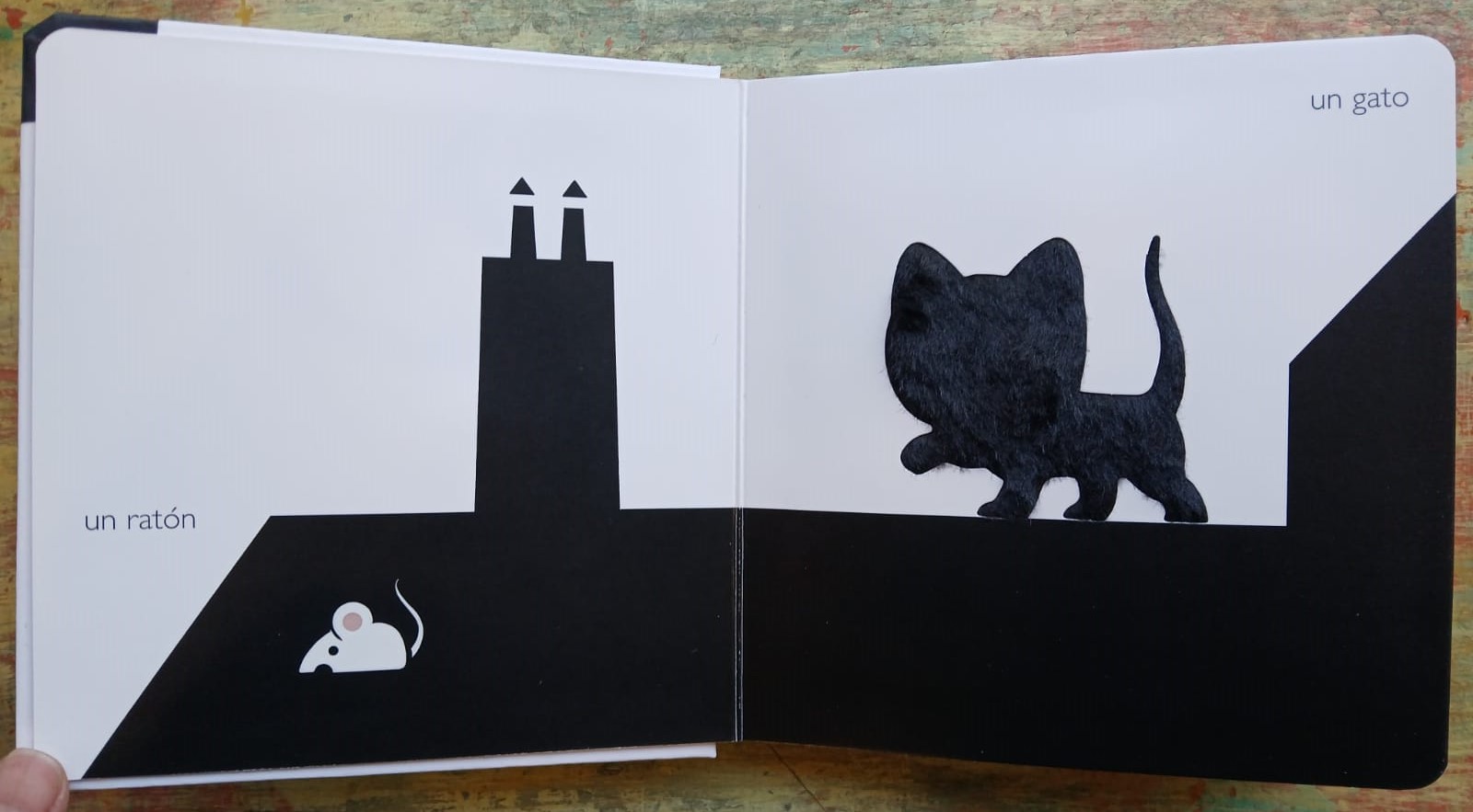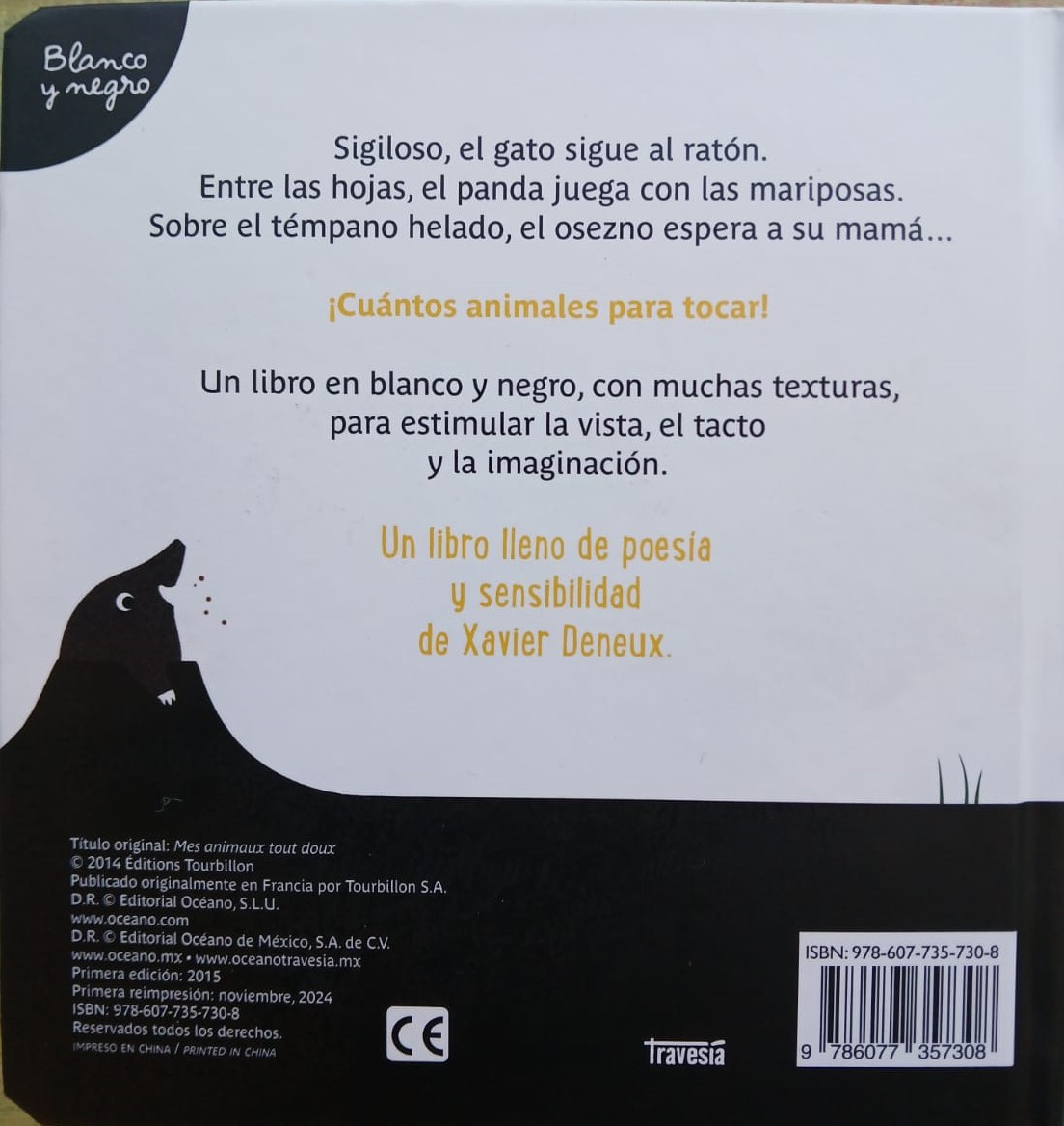 Sigiloso, el gato sigue al ratón. Entre las hojas, el panda juega con las mariposas. Sobre el témpano helado, el osezno espera a su mamá… ¡Cuántos animales por tocar! Un libro en blanco y negro, con muchas texturas, para estimular la vista, el tacto y la imaginación.