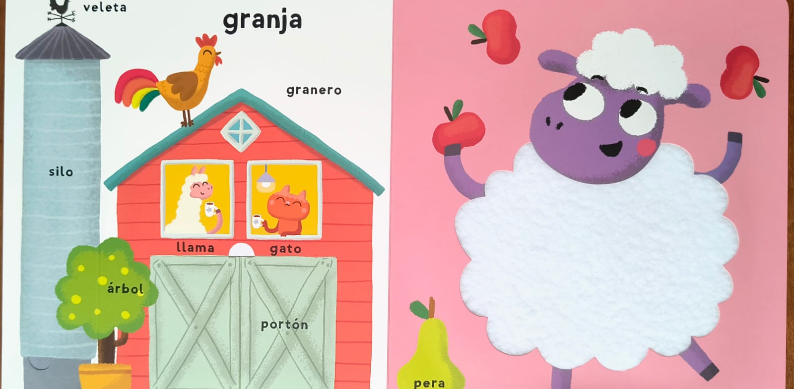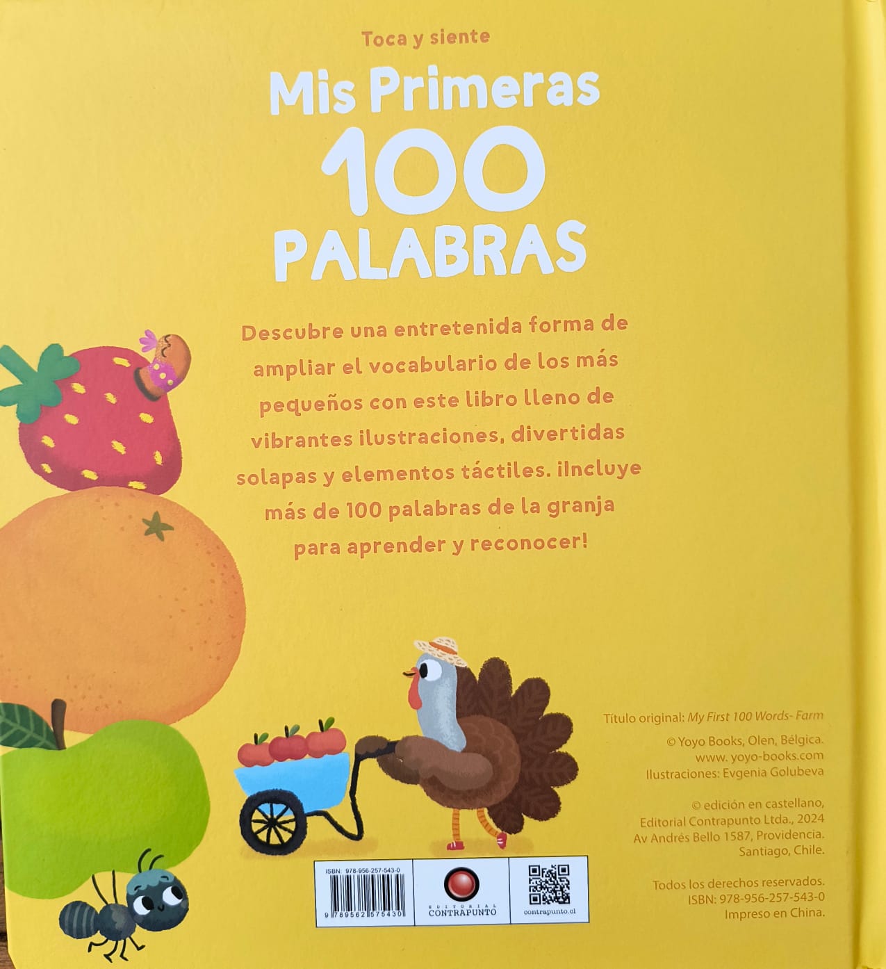 Este volumen, concebido por Evgenia Golubeva, presenta más de 100 palabras relacionadas con la granja organizadas junto a imágenes claras y texturas que favorecen la asociación visual y la exploración sensorial. Forma parte de la colección Mis primeras 100 palabras. Toca y siente, pensada para introducir conceptos básicos a través del juego y la manipulación, facilitando el desarrollo del lenguaje desde los primeros años.