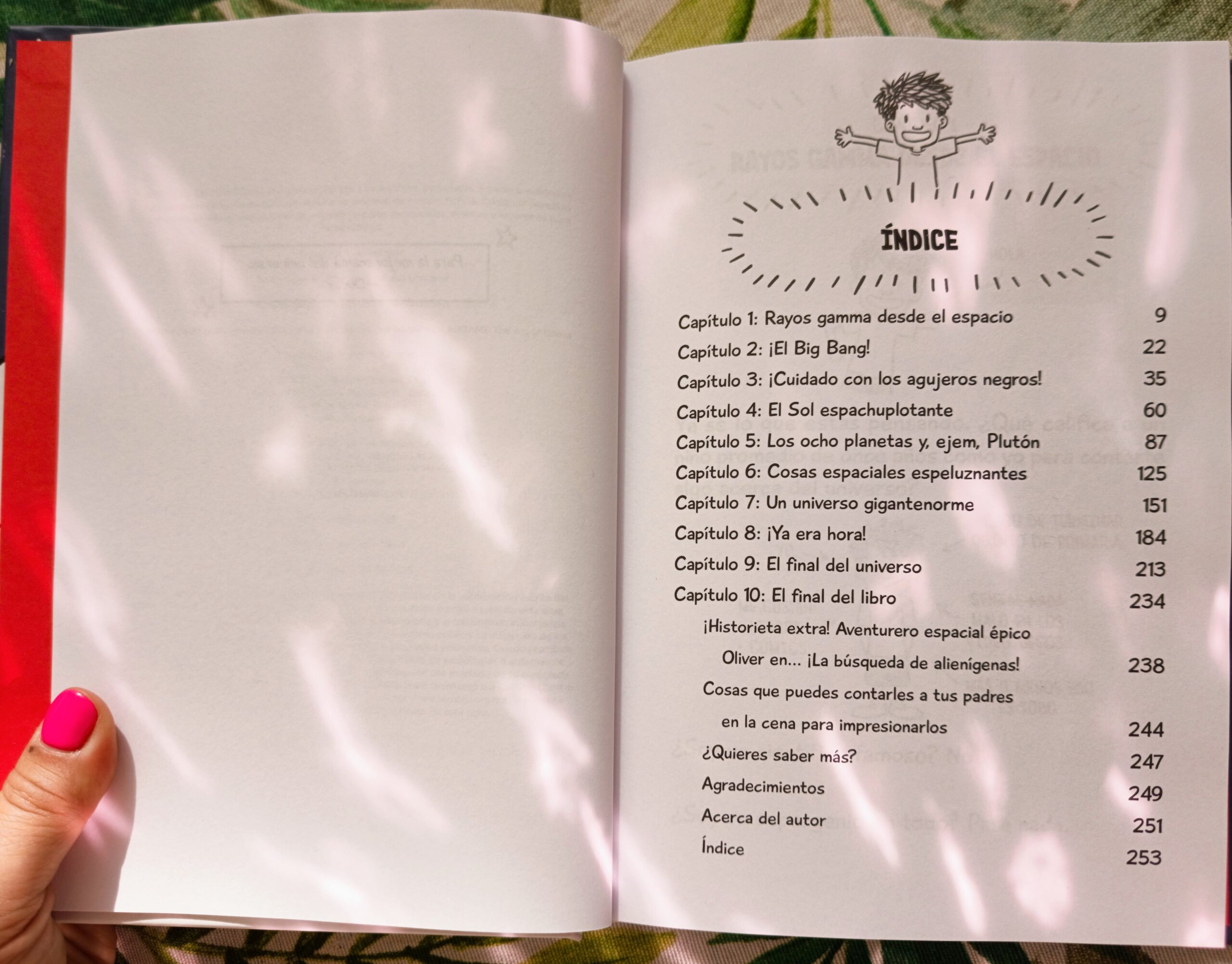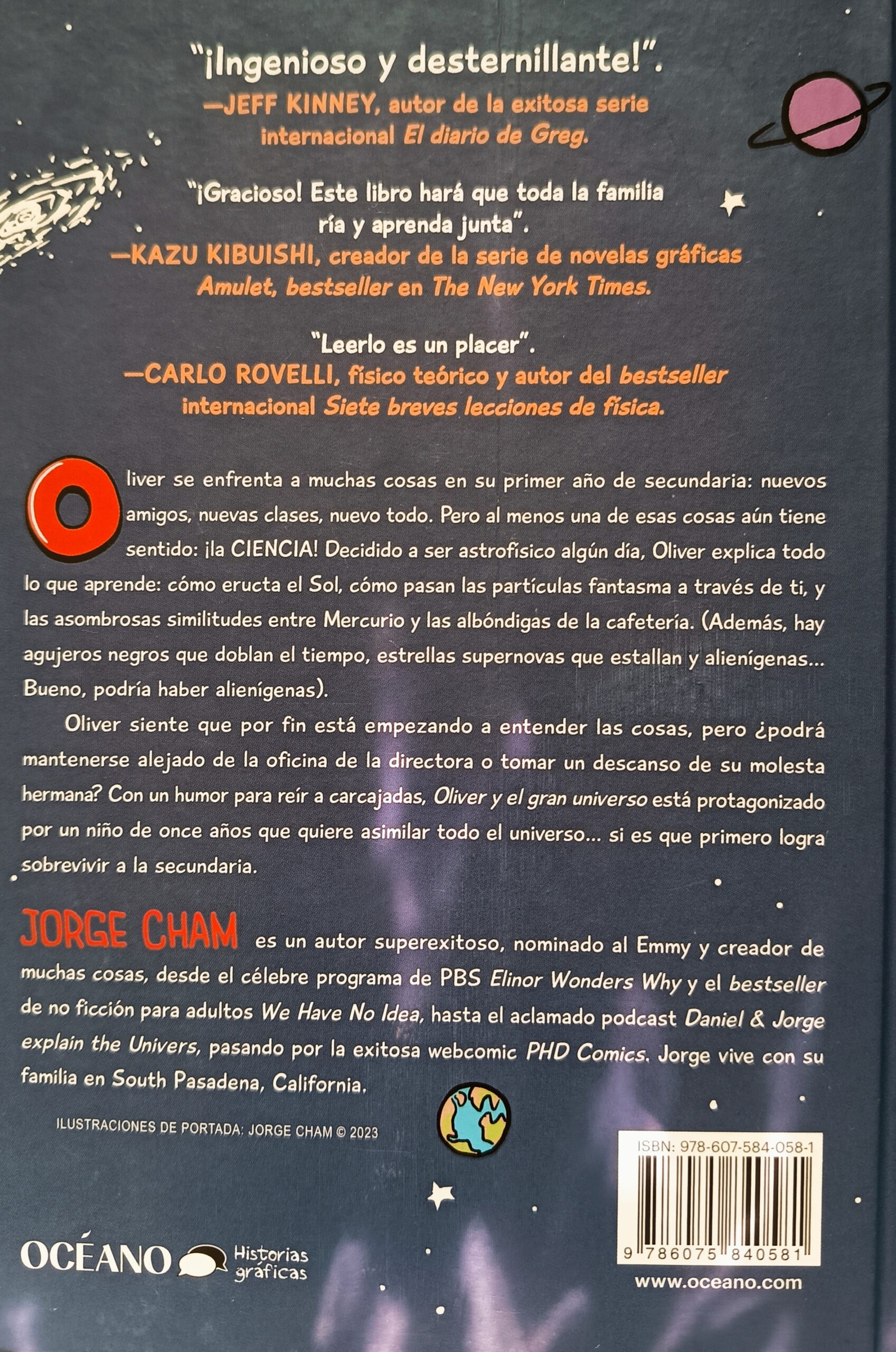 En este primer libro de una serie de cómics que mezclan la ficción y no ficción de una manera muy divertida, conocemos a Oliver, un chico de 11 años, bastante distraído pero con una idea fija: ser astrofísico, no sabe muy bien por qué o qué significa, pero está obsesionado con la ciencia. Oliver no está solo en esta aventura, su maestro, el Dr. Howard, que es algo regañón y severo, le enseñará todo lo que debe saber sobre el Universo, desde la teoría del Big Bang hasta las supernovas y más allá? Esto cada vez se pone más difícil, además de aprender conceptos complejos, Oliver tiene que lidiar con altibajos en su familia y con la complicada vida escolar?