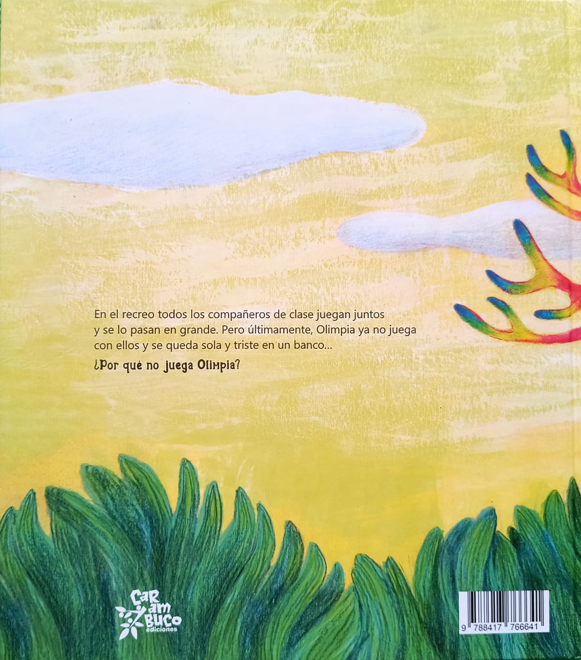 En el recreo, todos los compañeros de clase juegan juntos y se lo pasan en grande. Pero últimamente Olimpia ya no juega con ellos y se queda sola y triste en un banco. ¿Por qué no juega Olimpia? Álbum ilustrado sobre la gestión de los grupos de amigos en el cole y sus conflictos. Los protagonistas son animales en un entorno natural.