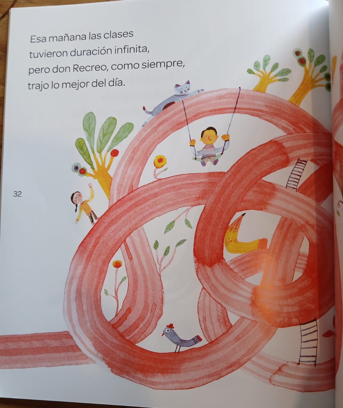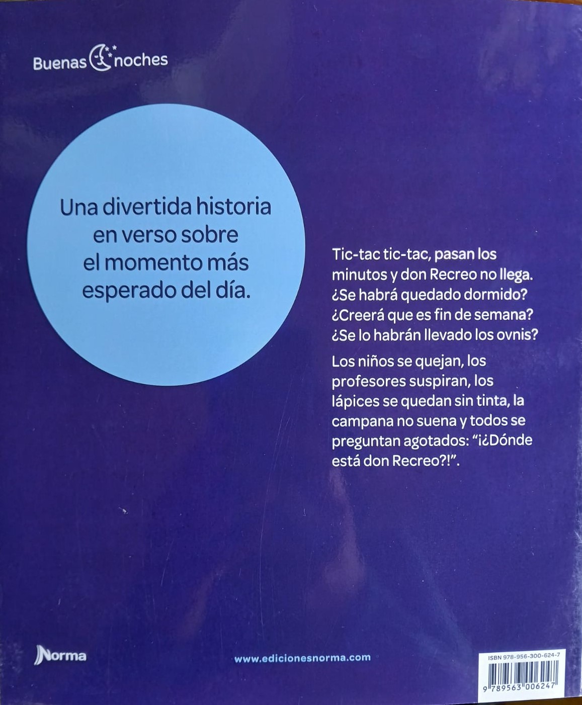 Tic tac tic tac, pasan los minutos y don Recreo no llega. ¿Se habrá quedado dormido? ¿Creerá que es fin de semana? ¿Se lo habrán llevado los ovnis? Los niños se quejan, los profesores suspiran, los lápices se quedan sin tinta, la campana no suena y todos se preguntan agotados: “¡¿Dónde está don Recreo?!”.