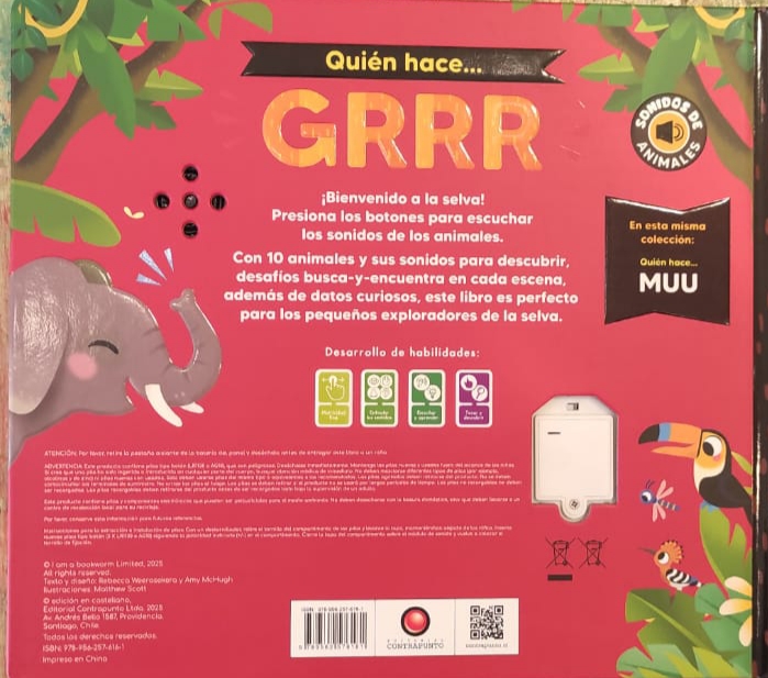 Una experiencia sonora y táctil para los primeros lectores que explora animales, vehículos y objetos cotidianos. En Quién hace… GRRR. Con 10 sonidos cada página presenta ilustraciones expresivas y un botón fácil de pulsar que reproduce diez efectos distintos, diseñados para captar la atención, entrenar la discriminación auditiva y enriquecer el vocabulario de los más pequeños.