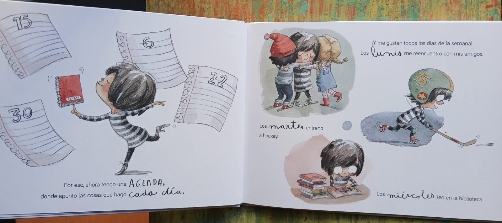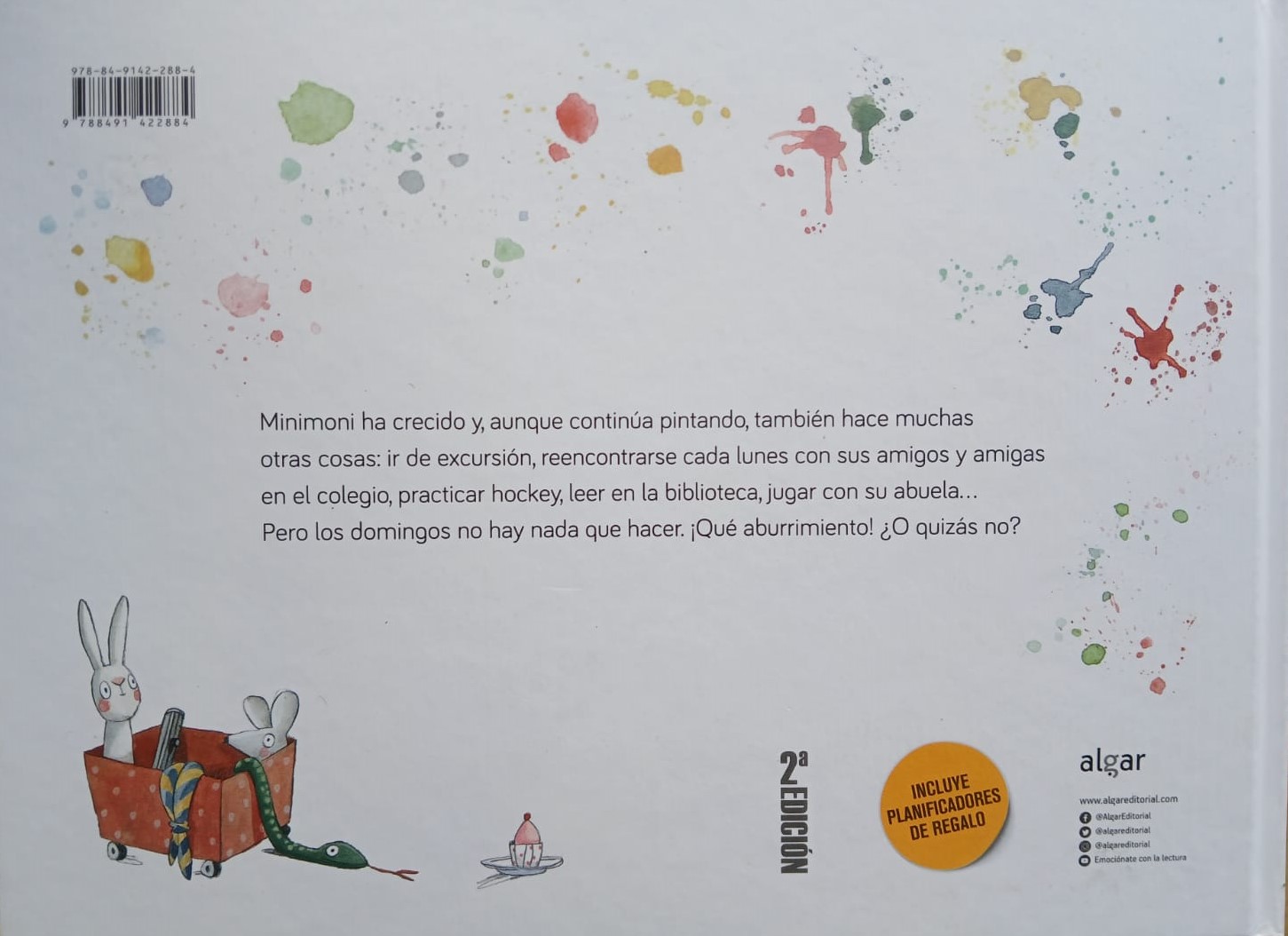 Minimoni ha crecido y, aunque continúa pintando, también hace muchas otras cosas: ir de excursión, reencontrarse cada lunes con sus amigos y amigas en el colegio, practicar hockey, leer en la biblioteca, jugar con su abuela… Pero los domingos no hay nada que hacer. ¡Qué aburrimiento! ¿O quizás no?