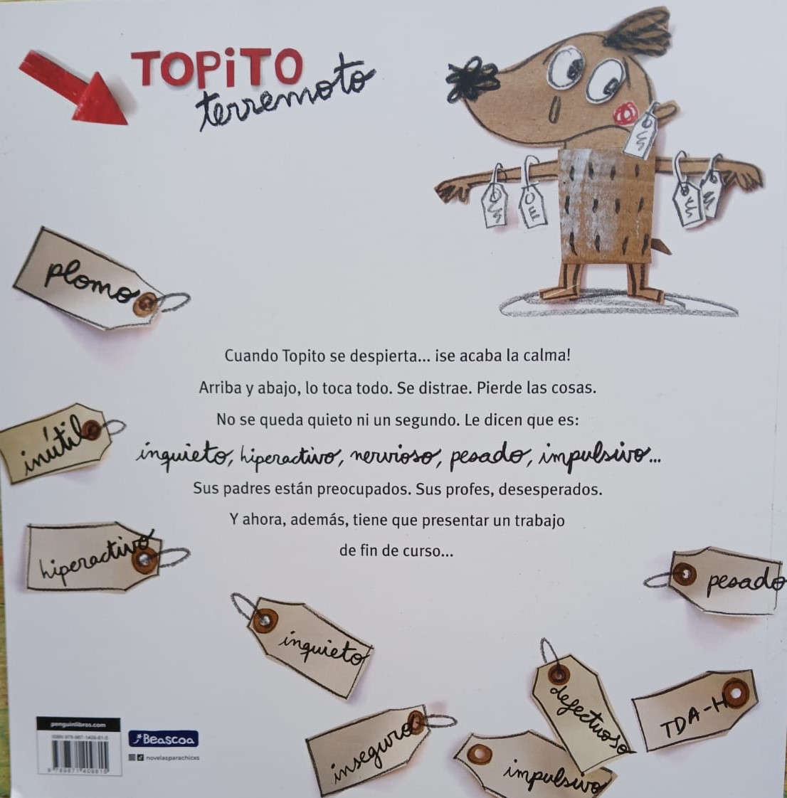 En el bosque, todo está tranquilo… ¡hasta que se despierta Topito terremoto! Y es que no para ni un segundo. Arriba y abajo, lo toca todo. Se distrae. Le cuesta prestar atención en clase. Se olvida de las cosas, pierde cosas, rompe cosas… Sus profesores están preocupados y los otros niños ya no quieren jugar con él. Un da, sus padres lo llevan a casa de Berta, el Hada del Bosque. Ella enseguida entiende qué le pasa, pero ¿podrá ayudarlo y conseguir que termine a tiempo el proyecto de final de curso?