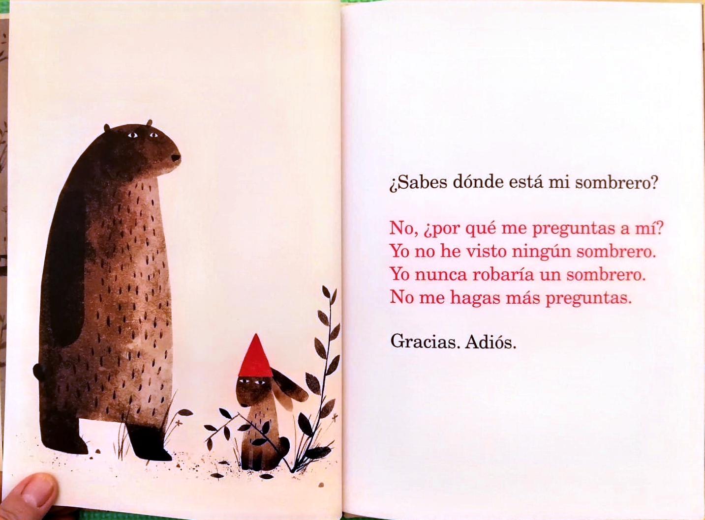 El oso no encuentra su sombrero y pregunta a otros animales si lo han visto. Todos contestan que no, ¡incluso el conejo que lleva el sombrero del oso en la cabeza! ¿Dónde puede estar el sombrero del oso? ¿Y si alguien lo hubiera robado? Entonces, un ciervo hace una pregunta que despierta la memoria del oso… ¿encontrará al ladrón?